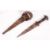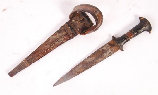 An early 20th century African Sudanese Mahdi Dervish Arm Dagger with carved and shaped wooden hilt, double edged triangular blade along with leather scabbard with arm thong. Measures; 36cm overall.