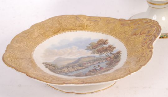 A 19th century Pratt / Prattware tazza depicting Chatsworth having classical greek borders on raised foot together with another depicting lovers and musician, river scene with washerwomen, and another non Pratt 19th century Victorian tazza marked Bouquet to underside. Chatsworth measures 24cms diam