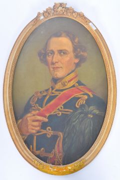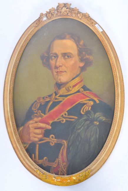 An early 20th century oil on board portrait painting study of the Rt Hon Lord De Tabley (1811-1895) Also Lt Col.Earl of Chesters Yeomanry Cavalry. Set within gilt oval frame and complete with notation plaque. Measures 75cm x 50cm