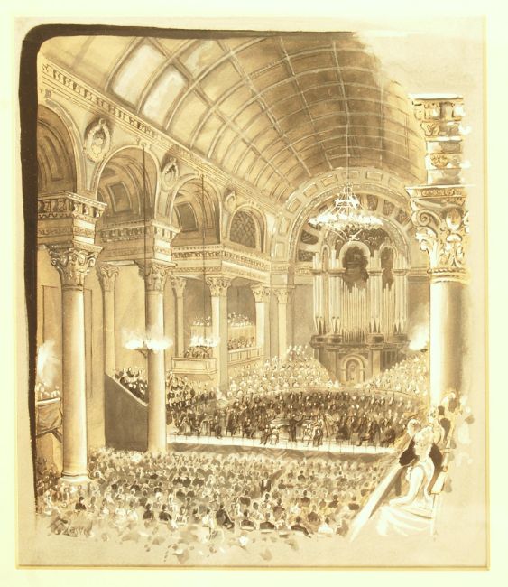Frederick George Lewin  1861 - 1933 ( Bristol Savages ) A series of 3 En Grisaille watercolour painting studies believed to be of Bristol, England. To include street scene with pub and dray, interior theatre scene with orchestra and anothes street scene with church,  monument and people . Signed monograms to each with good framed and glazing. Measures 54cms x 44cms ( frames )