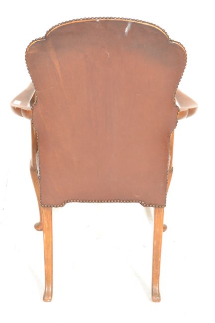 A 1920's 17th century revival walnut and leather Queen Anne revival armchair. Raised on cabriole legs with pad feet supporting a leather overstuffed seat and back rests flanked by scrolled elbow rests.