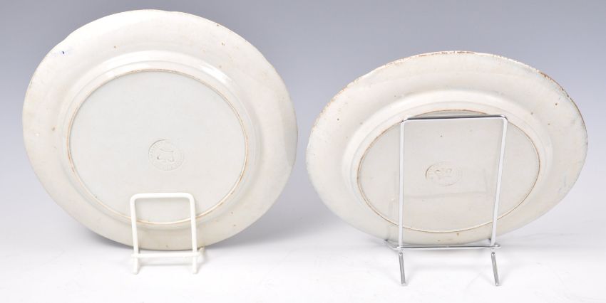 James & Ralph Clews - Clews Warranted Staffordshire of Codridge - A pair of early 19th Century Georgian blue and white transfer printed earthenware cabinet plates made for the American Market in the circa 1818. The plates of circular form with slight scalloping to the edges depicting vase of flowers on table with bird having further floral grape and vine border to edge. Impressed makers seal; mark to undersides. Condition is good on both with age related crazing. Great examples. Measures: 21cm wide.