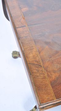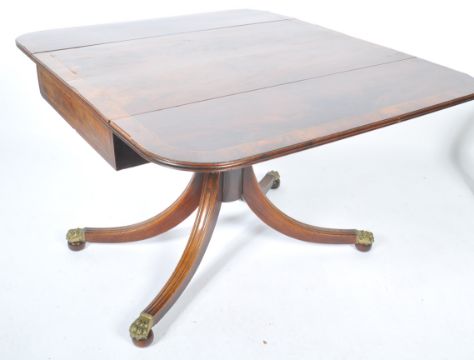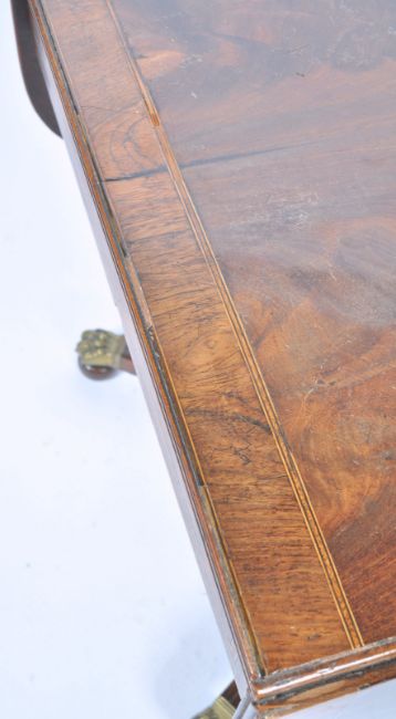A fine 19th century George III rosewood and satinwood crossbanded sofa table desk. Raised on a splayed quadruped leg base with brass cap castors supporting a fitted frieze with end drawer and drop leaves to the sides being raised on fly supports. Rosewood top with satinwood crossbanded inlaid decoration. Measures 72cm high x 103cm wide x 61cm depth