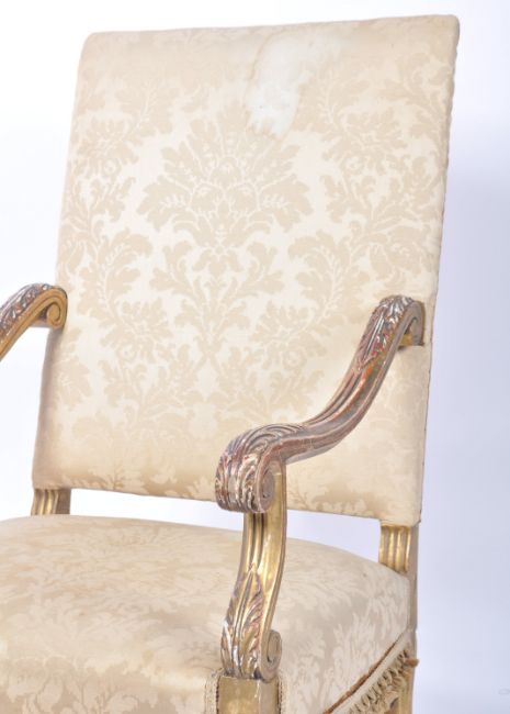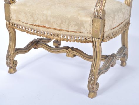 A 19th century French high back giltwood fauteuils / armchair. Raised on reeded serpentine legs united with a crinoline stretcher having an  overstuffed seat and high back rests flanked by scrolled elbow supports. Giltwood reeded show wood frame with gilt parcel apron.