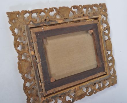 An oil on canvas portrait painting study of Beatrice Cenci looking over her shoulder in white gown and headdress. Thought to be circle of Guido Reni (1575-1642) The canvas set in a fine carved  florentine giltwood frame. Measures 42cm x 38cm approx.