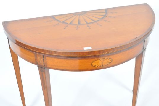 A rare and stunning 18th Century George III Georgian Sheraton Period satinwood card games / tea table of demi lune shape having large sunburst inlay decoration to top with further decoration to the frieze. Raised on fine tapering block legs and feet. Hinged lid opens to reveal green baize lined top with two folding legs to rear. Measures 76cm x 98cm.