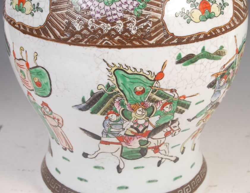 A 19th Century Chinese porcelain temple jar of bulbous form having crackle glaze white enamel ground with hand painted famille verte decoration depicting warriors, figures and mountains. Decorated floral borders and Greek key pattern complete with turned wooden finial cover.Brown incised character mark seal to base. Measures: 33cm tall. Firing fault to rim (not damage).