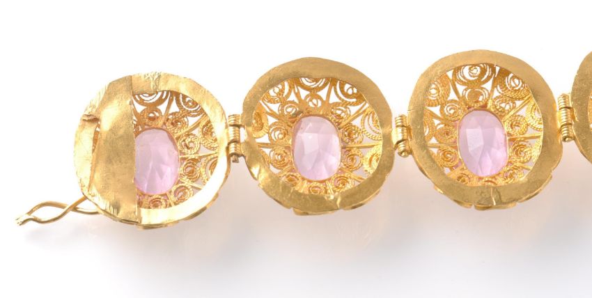 An 18ct gold filigree work and pink stone bracelet and matching pin. The bracelet having fine filigree work gold links set with large mixed cut pink stones. Measures approx bracelet 17cms, pin head 2cms. Weight bracelet 30.4g. Pin 3.8g. (The pin was made from a spare link to the bracelet when it was re-sized for the vendor by the jeweller)