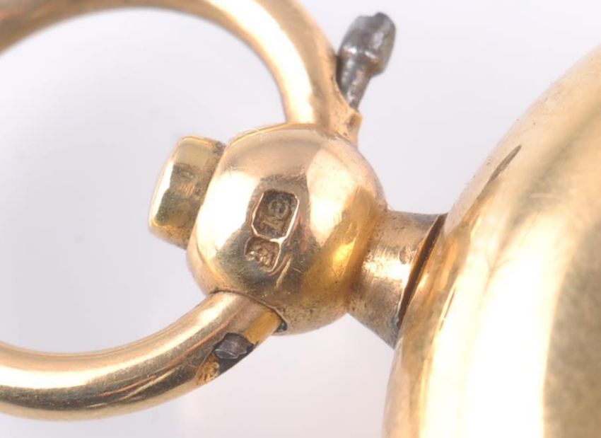 An 18ct gold hallmarked Victorian 19th century sovereign holder, Stamped 18ct, date letter T. The facia with enamelled coat of arms. Finished with bale atop. Measures 4 cms high / weight 26.55g