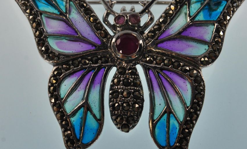 A silver and plique a jour brooch in the form of a butterfly having a central red stone and eyes with marcasite borders. Stamped 925 to verso. Gross weight 15.4g. Measures 4.5cm tall by 5.5cm wide.