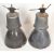 A matching pair of large vintage industrial 20th Century factory black enamel ceiling lights. Each retaining the original fixture points with large black half moon pendant shades. One slightly lighter in colour. Measures 90 cm x 50 cm.