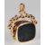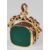 An English hallmarked 9ct gold pocket watch swivel fob weight having a scrolled decoration mount, the swivel being set with green and black stone panels. Hallmarked London 1975. Weight 9.0g.