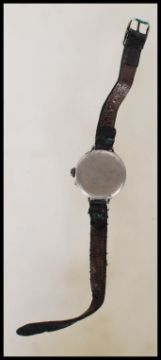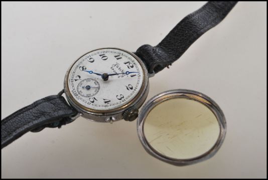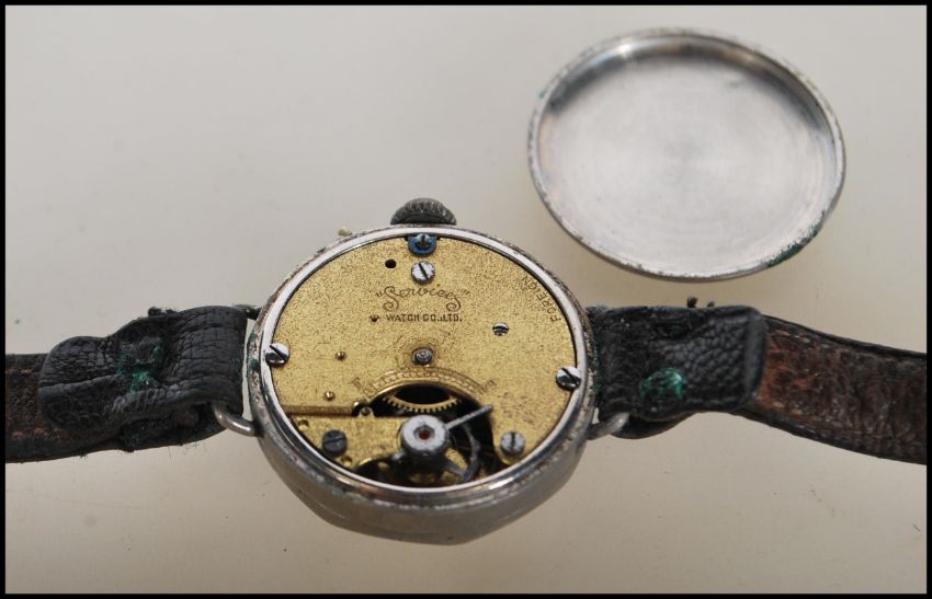 A vintage 20th Century Services Sports military gents mechanical wrist watch, having a stainless steel octagonal face, champagne dial with Arabic numeral chapter ring with subsidiary seconds dial, set to a leather strap.