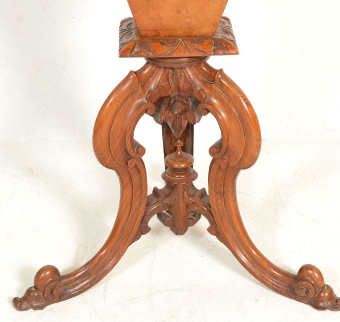 A 19th Century  Victorian walnut work box raised on tripod supports with scrolled feet, the box having a hinge top with scutcheon front, opening to reveal a compartmentalised interior lined with decorative printed paper, having a hinged writing slope and a central tapering recess.