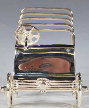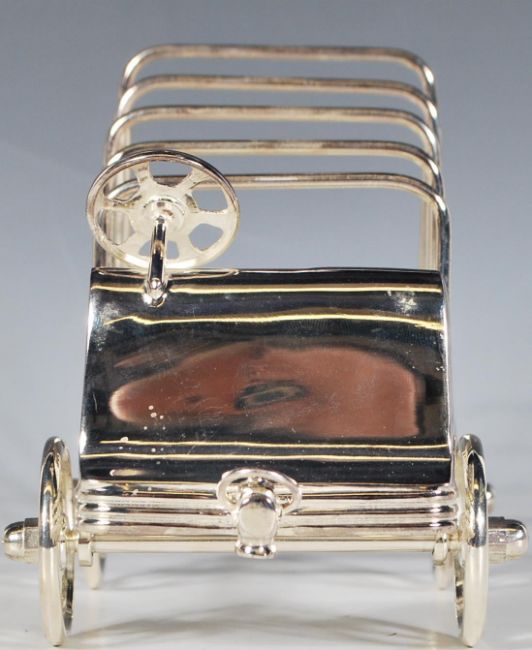A contemporary silver plate toast rack in the form of a vintage motor vehicle. The racks of graduating sizes having articulated wheels. Marks for Van Bergh Silver Plate Co. Measures 13cm tall by 10cm wide and 16cm deep