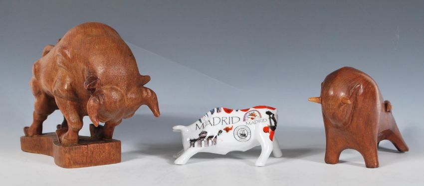 A retro mid 20th Century carved wood figure in the form of a charging bull in the manner of Artesania Emilio Ferrer, signed to base for CAR dated 1960. Together with another carved wood figure of a charging bull raised on a plinth base and a smaller ceramic tourist ware bull from Madrid. Biggest measures 19cm tall by 27cm wide.