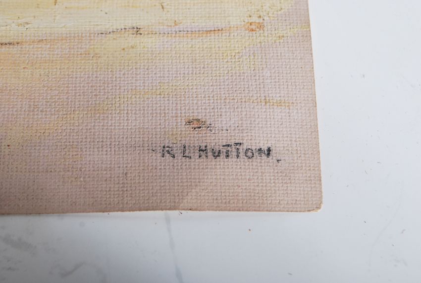 Roger L Hutton- A 20th Century oil painting on textured paper depicting a Cornish coastal scene with figures on the beach and cottages to the background. Signed to lower right R L Hutton. Unframed. Measures 25cm tall by 18cm wide.