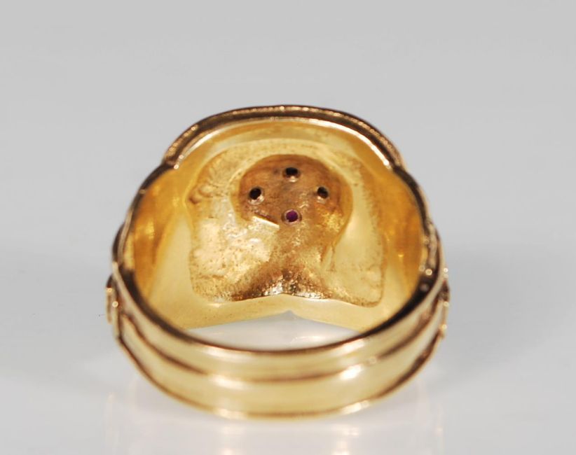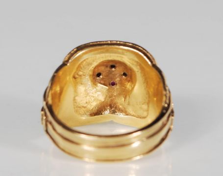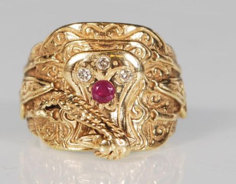 A 9ct gold English hallmarked saddle ring in the form of a western saddle with stirrups and a coiled rope on the pommel set with three round cut white stones and a round cut red stone. Assay marked for Sheffield. Weight 16.8g.