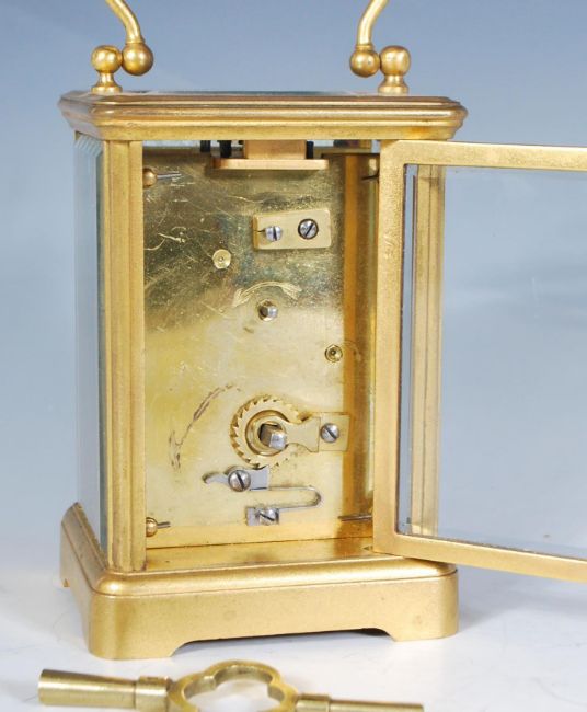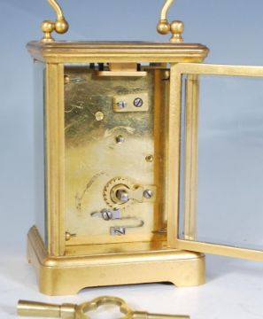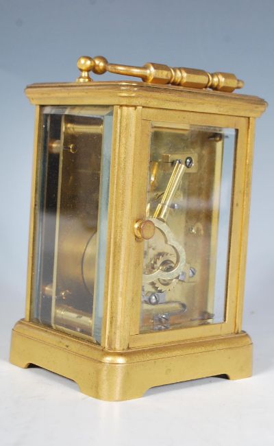 A 19th Century antique brass cased carriage clock raised on a plinth base with reeded supports, having glass panels to the sides and top with exposed mechanism inside having a swing handle to the top, the face being white enamelled with a roman numeral chapter ring. Measures 16cm tall.