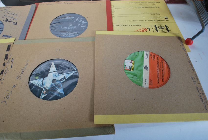 A collection of vintage singles 7" 45 RPM EP vinyl records to include artists Elvis Presley, Ringo Star, Emerson Lake & Palmer, Rick Dees and his cast of idiots 'Disco Duck', multiple David Bowie 'Space Oddity', 'Rebel Rebel', 'Heroes', 'Golden Years' etc, multiple of The Beatles 'I want to hold your hand', 'Hello, Goodbye' etc, UB40, Michael Jackson, Kraftwerk, Bee Gees, Beach Boys and many more.