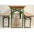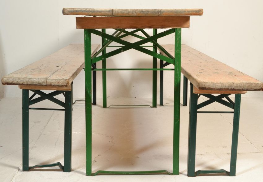 A mid 20th Century Industrial factory festival work benches and matching table. Each of panelled wood with folding metal legs being stamped to the underside, believed German.
