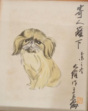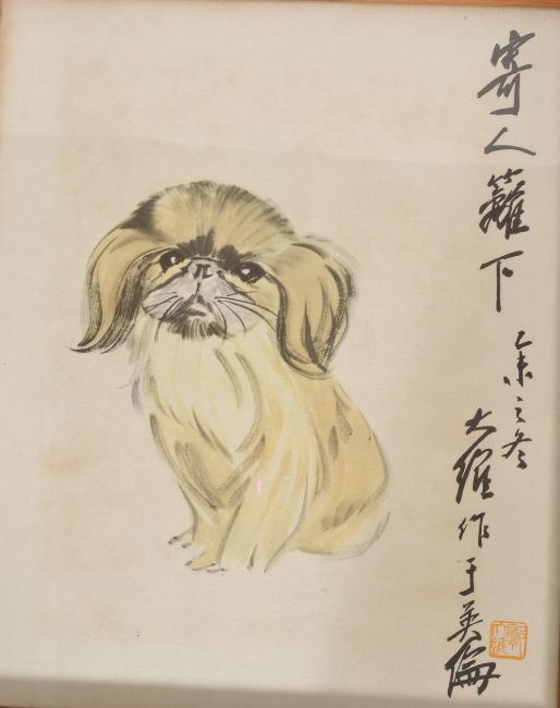 A 20th century watercolour painting on paper depicting the interior of a Buddhist temple having red lacquered columns with chinese inscriptions, having Buddha statues to the background and the temple adorned with incense etc. Unsigned. Framed and glazed. Together with a smaller print depicting a pekingese dog.  Measures 65cm x 50cm.