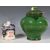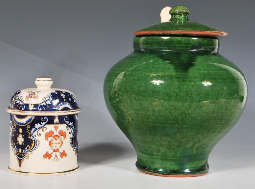 A 20th Century studio pottery terracotta olive jar finished with a green glaze, of bulbous tapering form with having a finial lid to the top together with a 19th Century Victorian Imari lidded pot of cylindrical form. Olive jar measures 20cm tall.