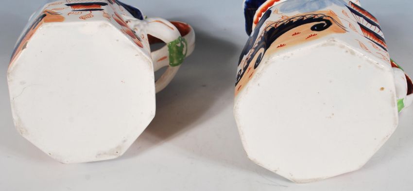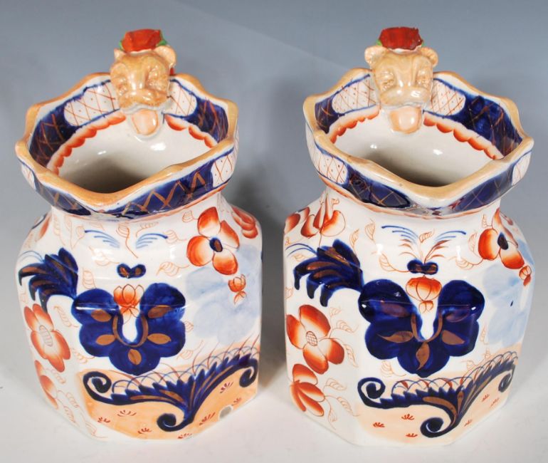 A pair of 10th Century Victorian Mason's lustre glazed hydra jugs of octagonal form with lions mask handles being hand painted in blue and red in the Imari pattern with gilt detailing. Measures 16cm tall.