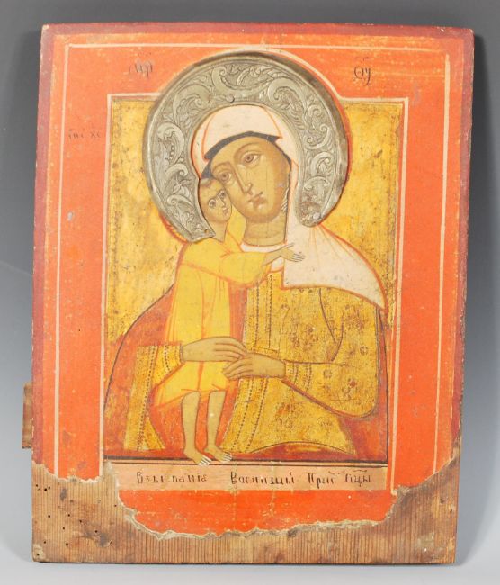 A 19th Century Russian School Religious Icon painting on panel depicting the The Virgin of Vladimir. Hand painted on gesso and mounted on pine board. Central gilt panel with silver rococo scrollwork halo above head. Lettering to borders. Comes with beloved Russian museum paperwork. Measures 30cm x 24cm.