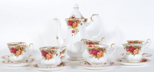 A Royal Albert Old Country Roses pattern coffee service comprising of coffee pot, six cups and saucers, cake stand (Missing stems) sugar bowl and creamer / milk jug. Together with with other Royal Albert Old Country Roses pieces to include two tea cups, creamer / milk jug and sugar bowl and one saucer.  All having floral patterns with gilt rims. Marks to bases. Coffee pot measures 23cm tall.