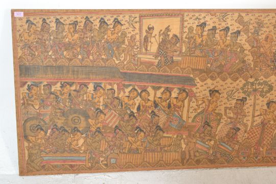 A large Indonesian believed early 20th century screen print on fabric diorama scene of a court scene with male and female dancers. Measures 195cms x 76cms