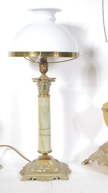 A 20th Century 1940's brass and onyx Corinthian Column table lamp raised on square scroll and foliate brass base with opaque glass shade. Together with two latter table lamps having faux onyx stems raised on brass bases. Onyx lamp measures 44cm tall without shade. Measure 70cm tall.