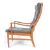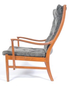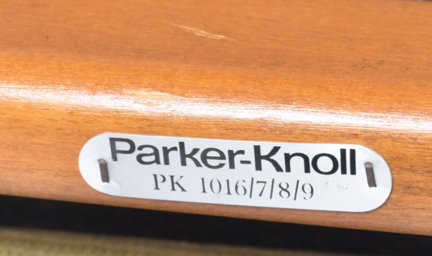 Parker Knoll - PK1016/7/8/9 - A 20th century retro vintage teak wood easy / lounge chair / armchair having a tall slatted ladder back backrest with button backed pad seat and backrest cushions, shaped teak arms and all raised on tapering legs. Metal plaque to underside. Measures; 98cm x 66cm x 76cm.