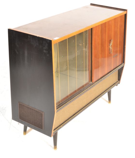 A mid 20th century teak wood cased radiogram / stereogram having inset radio and Monarch record desk. Measures 87 cm high x 106 cm wide x 40 cm deep.