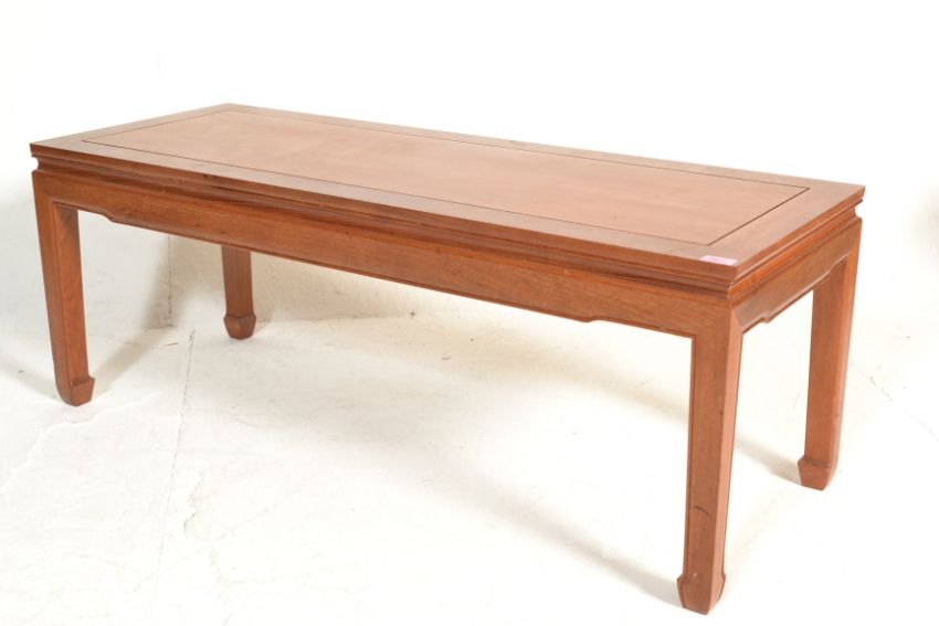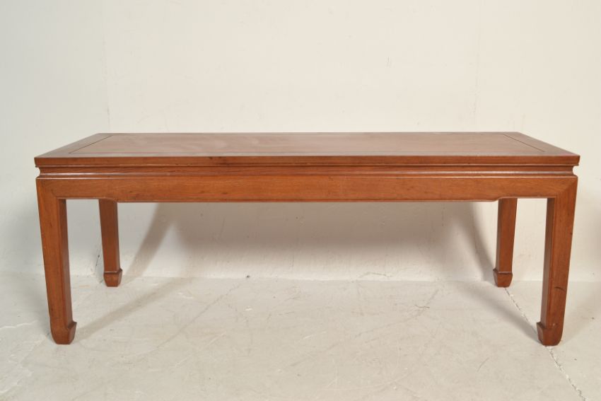 A 20th century Chinese hardwood rectangular coffee table. Raised on squared legs with carved reeded and detailing. Above, a shaped rectangular top with reeded border. Measures 46cm x 122cm x 42cm.