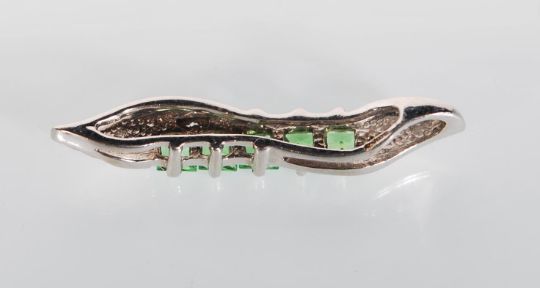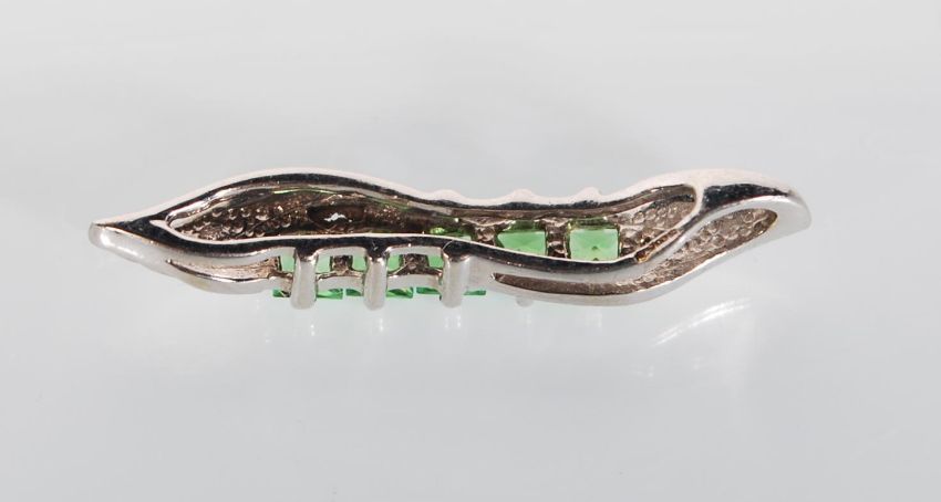 A hallmarked 9ct white gold pendant set with five square cut green stones. Hallmarked 375 for Birmingham. Gross weight 2.1g. Measures 3cm long.