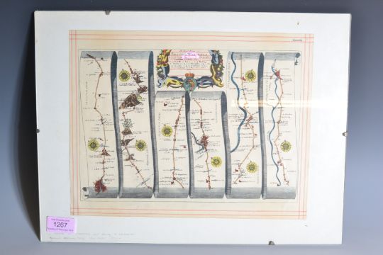 After John Ogilby - A hand coloured engraved antique map of the Road from Bristol to Worcester depicting drawn across a winding scroll having another map to the verso of the Road from Bristol to Weymouth, maps marked as plate 59 and 60. 30cm x 40cms