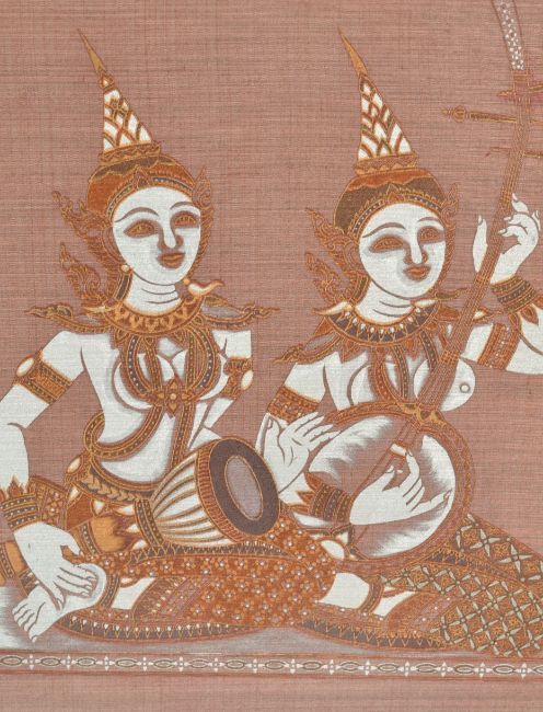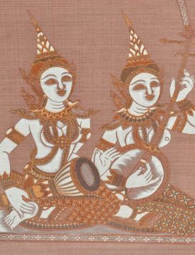 A pair of 20th century Thai screen prints on silk each depicting stylised teppanom Thai figures / angels dancing and playing instruments. Both framed and glazed in gilt and pink silk frames.
