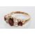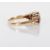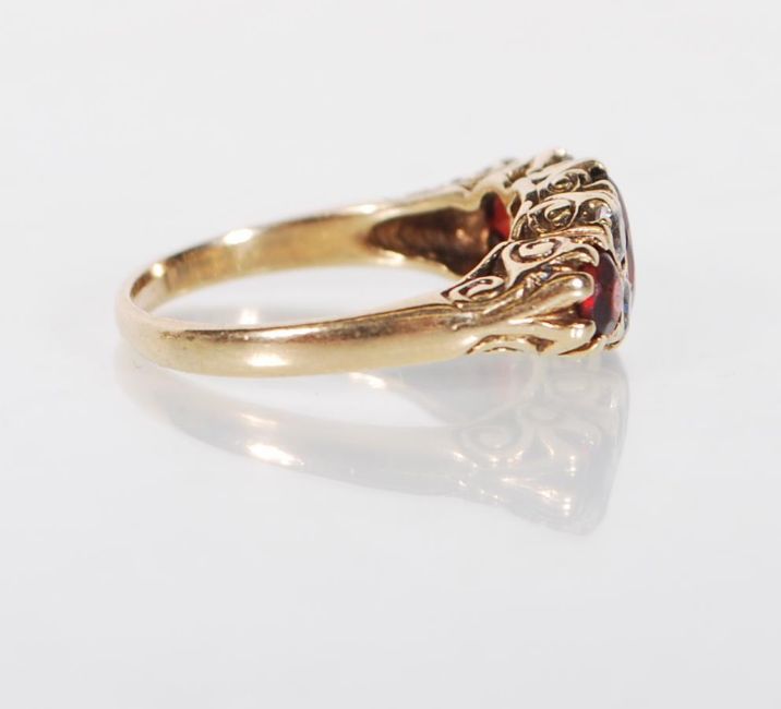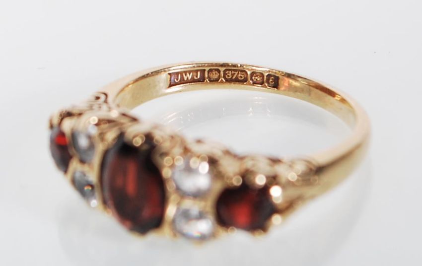 An English hallmarked 375 9ct yellow gold ring having a central faceted cut red stone flanked by two white stone to both sides with further red stones atop the shoulders. Hallmarked 375 for Birmingham date letter E 1979. Gross weight 3.1g. Ring size L.