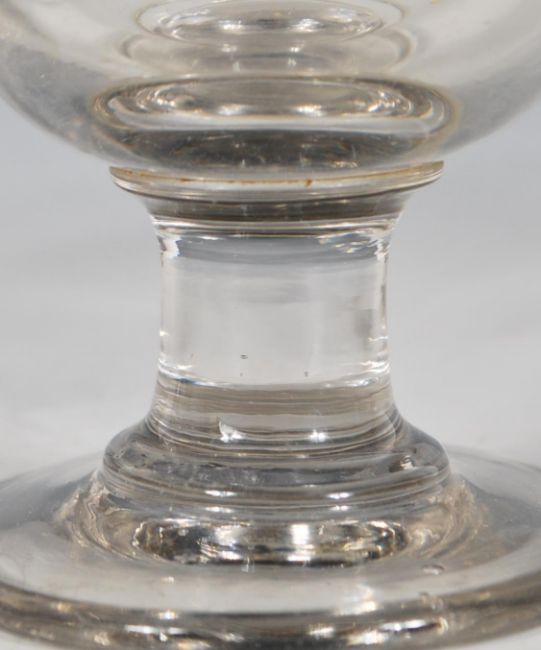 Two 19th century Georgian rummer glasses to include a glass having a round foot with knopped stem and cylindrical bowl and a another having a round foot with a tapering cylindrical bowl. Measures: 13cm x 9cm diameter.