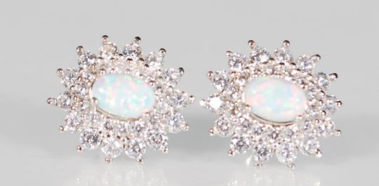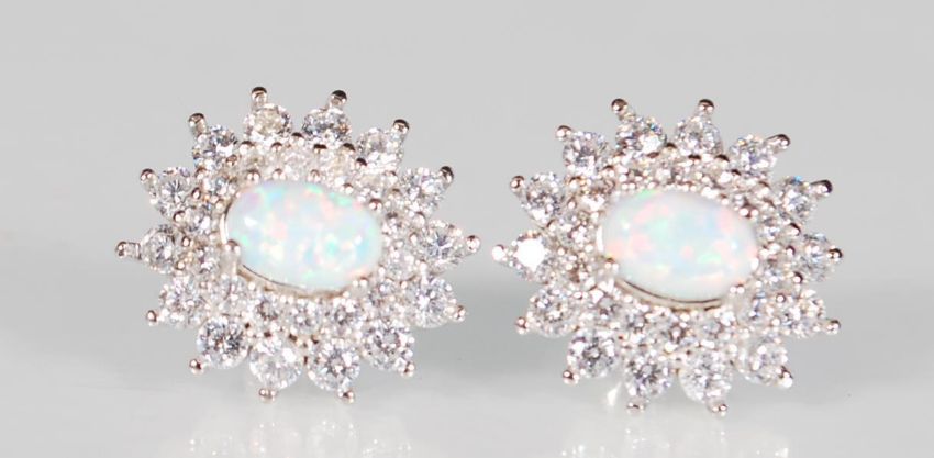 A pair of silver stud earrings set with central opal cabochons surrounded by CZ's. Stamped 925. Gross weight 3.8g. Measures 1.5cm diameter.