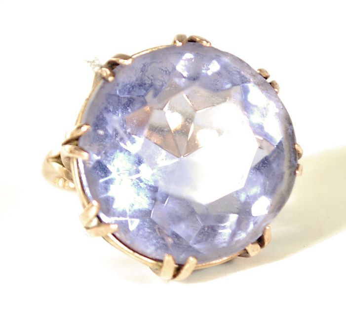 A stamped 9ct gold ladies dress ring set with a large round faceted purple stone. Weight 11.5g. Size P.