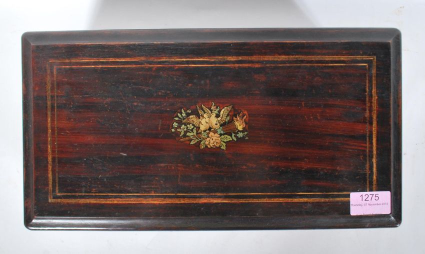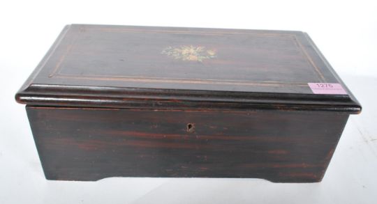 A 19th Century Victorian simulated coromandel and mahogany music box, 3.5" drum, playing four airs. The music box appears to play but lacking some teeth.