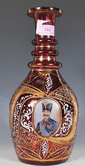 A vintage 20th Century Cranberry glass Bohemian style decanter decorated with three panels of a military gentleman in period uniform, applied gilt detailing and hand applied scroll work. Measures 22cm tall.