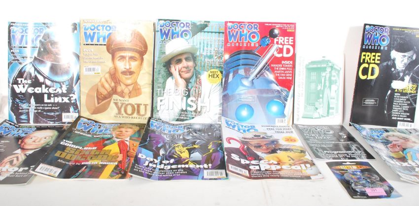 A vintage 20th Century Doctor Who ' The Dalek Outer Space Book ' 1966 hardback book together with a collection of Doctor Who magazines and a set of four sealed pin badges.