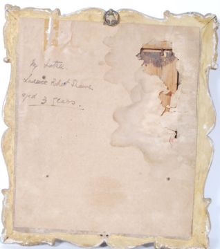 A 19th Century watercolour and pencil on paper study of a child angel emerging from a cloud, painted with striking blue eyes and draper having a pencil notation to the corner ' Scott 1817', set within a gilt moulded gesso frame having scrolled gilt borders. Notation to the back of the frame reads 'My Father Lawrence Rohert Shauve (?) aged 3 years'. Measures 30cm high x 26.5cm wide (frame).