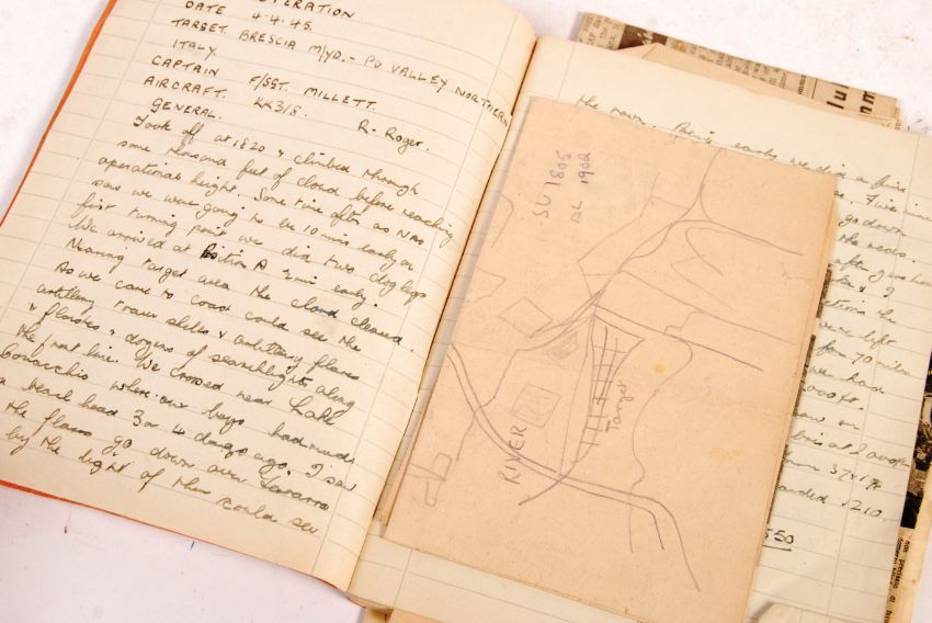 1693861 Flight Sergeant JA Wray (Bomb Aimer) of 70 Squadron and 40 Squadron (his raid diaries list him as 70 Squadron, 231 Wing, 205 Group). Appears to have joined in the early 1940's in the Royal Air Force Volunteer Reserves. MEDAL CARD SAYS AWARDED 39-45 STAR, ITALY STAR, DEFENCE MEDAL (ALSO SEE TUNIC)Uniform: Wray's Uniform is also included, which comprises his 1944 pattern Dress Blouse (size 8) and his forage cap, with late-war issued RAF badge to front. His Bomb Aimer patch present, as well as his medal ribbon bar. A collection of photographs of Wray, his crew and various other views taken during (and after) service - includes a photograph of his crew stood infront of a heavy bomber, photograph of a Wellington in flight (dated 1944), whole photograph of 70 Squadron, ' B Flight - 40 Squadron ', and others. A large scrap book filled with all manner of related documents, all relating to Wray, is also included. Within the album are various official documents, cards and notes from Wray's time in service. Including: National Service cards, Air Crew Acceptance documents, receipts for uniform and expenses, tickets and programmes from entertainment occasions, medal cards, canteen menus, target practise targets, programmes and leaflets, 'Army Welfare News', items from Italy and South Africa, and many other items (likely 200+ items within this album).Also within the collection are two incredible unique ' Lineshoots ' raid diaries by Wray. Spanning two lined notebooks, each and every raid Wray took part in is listed in great detail - including details of his crew, targets and even the aircraft which took part. Each raid is detailed down to its success (or not) and whether any damage was taken, the bomb payload etc. 'Vol I' includes several never-before-seen bomb photographs (taken at the moment of impact by the bomb release camera). Both albums feature a host of period cuttings, German propaganda and other items that relate to the specific raids. Some astonishing content within, which makes for some fascinating and sombre reading. Of note within Vol I (abridged for cataloguing purposes):  'No.1 Operation - Target: Road Between Podgorica-Klopot... Cloud spoiled the day, bombing attack only 11 of 26 saw target sufficiently clear to bomb although one crew claimed a direct hit on a bridge...duration 3hrs 10mins.''No.8 Operation - 15.1.45 - 28 aircraft were off to drop supplies to partisans. Due to cloud obscuring target, only three aircraft were able to locate and drop their containers. All aircraft returned to base...''No.10 Operation - 20.1.45 - Target: Udine Marshalling Yards, North Italy....heavy damage is seen to industrial and rail installations...yards were inactive at time of photography... Casualties: Sgt Wilson's crew...was missing. They ditched...after 3 days were picked up by a navy corvette...broke his leg and wireless operator never got out of plane... C Charlie returned back with engine trouble and...came back because all bombs hung up'(Volume 1 covers operations No.1 to No.19 - largely railway / marshalling yards and roads etc)Vol.II which covers operations No.20 to No.26, and features similar detailed notes on each raid. The final one (No.26) ends with ' This was the last operation of 205 group ' and is dated as being 25.4.45. The diaries alone represent an incredible unique window into the world of a WWII RAF Bomb Aimer / Flight Sergeant in Bomber Command. Fascinating reading, and an important part of WWII history. Also included within the collection is a wealth of paperwork - both official and unofficial relating to Wray, various aircraft documents, training manuals (many marked 'Restricted'), letters to and from Wray (some with censor marks) and various post-war items including various later-issued books with dedicated to Wray, newspaper cuttings, bombing maps and photographs, a raft of Wray's original training notes - including how to use the instruments in an aircraft, how RADAR works etc. Hundreds of documents, letters, notes and booklets. One of the most fascinating collections we have ever come across, and an incredibly important part of history.