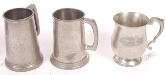 A collection of nine 20th Century military / police related pewter tankards all pertaining to a single gentleman Sgt Hartley. All with various notation some with enamel crests. Measures: 12cm tall.