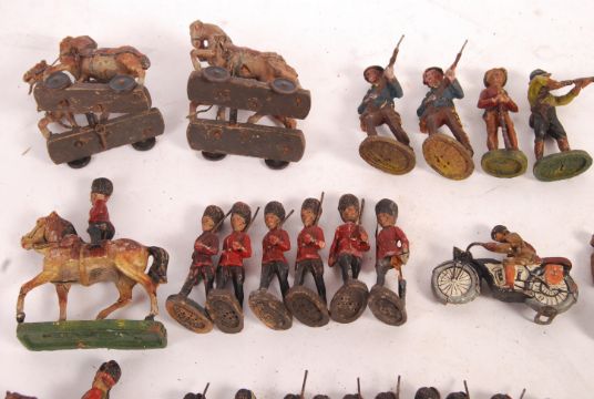 A collection of assorted early 20th century antique German WWI First World War Elastolin toy model soldier figures comprising Beefeaters, Queen's Guards, British Infantry and others. Most in having damage and parts missing. Includes some mounted examples.