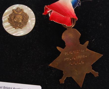 A WWI First World War medal pair awarded to a PLY 10215 Private Harry Brine of the RMLI ( Royal Marine Light Infantry ). Comprising his 1914-15 Star and his Long Service Good Conduct Medal, impressed to rim. Both with original ribbons. Along with a sweetheart brooch in mother of pearl.